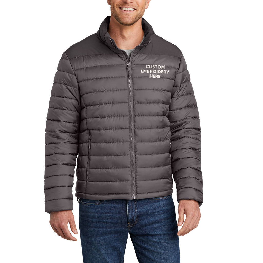 With horizonal baffles, a slight sheen and insulation that simulates down feathers, this is the newest puffy on the horizon. A water-resistant finish helps keep light rain out.